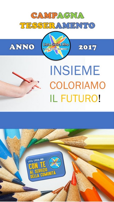Con un po’ di ritardo apriamo la CAMPAGNA TESSERAMENTO DI LISTA CIVICA RHO per l’anno 2017. Dopo l’esperienza iniziata lo scorso anno con le elezioni amministrative che ci hanno visto raggiungere importanti obiettivi, per Lista Civica Rho inizia un nuovo percorso all’interno della “politica” rhodense. Inizia un percorso rappresentato da un modo diverso d’intendere e di fare politica. Il punto di partenza dell’attivismo di LCR è l’ASCOLTO del cittadino, la CONDIVISIONE delle nostre idee con esso al fine di intervenire con AZIONI CONCRETE poste a migliorare il benessere della città.